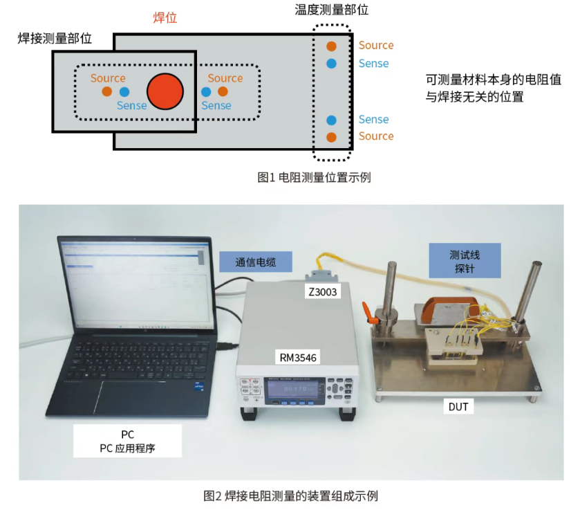 使用 A-TC功能时,除焊接测量部位外,还需测量DUT未焊接区域的电阻值以获取温度信息。因此需按图1所示,对两个位置进行测量。由于两处电阻测量均要求高精度,需分别采用4端子连接方式布线;具体可按图2所示,从RM3546背面的多路转换器单元Z3003 进行接线。