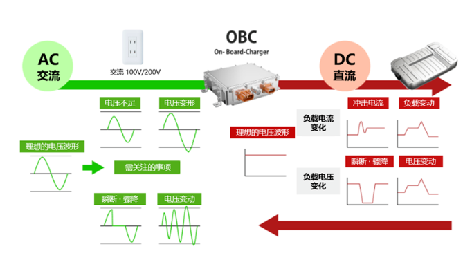 OBC(ON-board Charger)车载充电器是将家用插座等的交流(AC)转换为直流(DC),然后对电池进行充电的车载电器元件。近年来,车载充电器不仅可对应V2H模式,可应用于休闲以及灾害时用电源,还出现了与接线盒等其他组件集成的模块类型。对车载充电器的要求为在 AC 侧即使发生电压不足、电压变形...