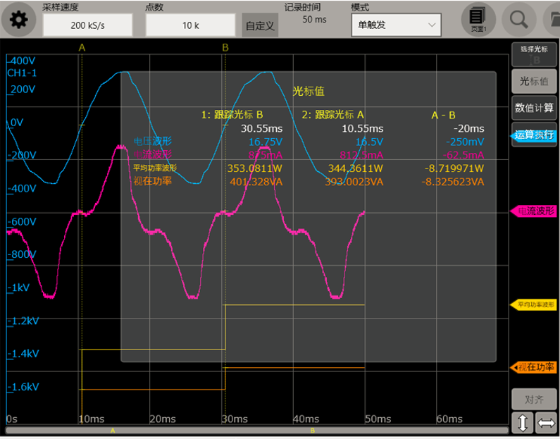 在较短的时间内,负载发生变化时的每1个周期的有功功率(P)、无功功率(Q)、视在功率(S)、电压有效值(Urms)、电流有效值(Irms)等。